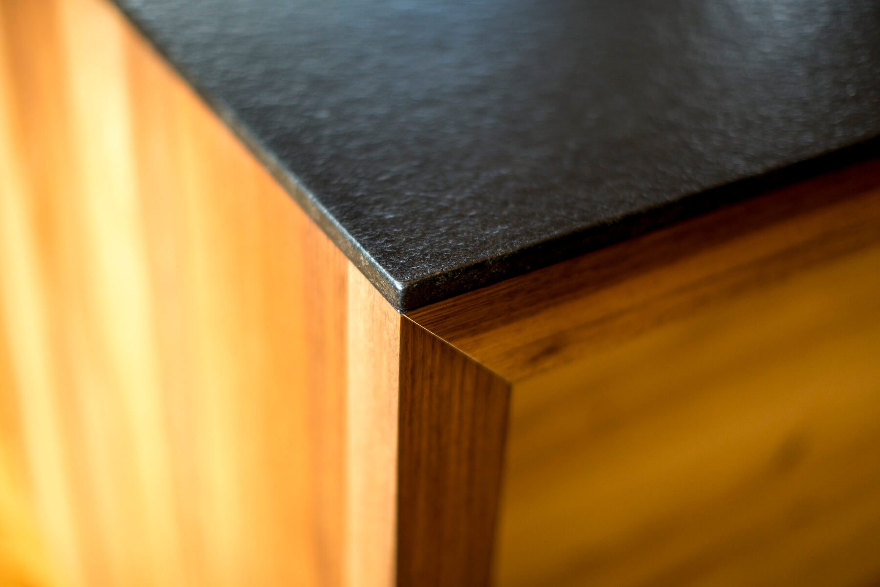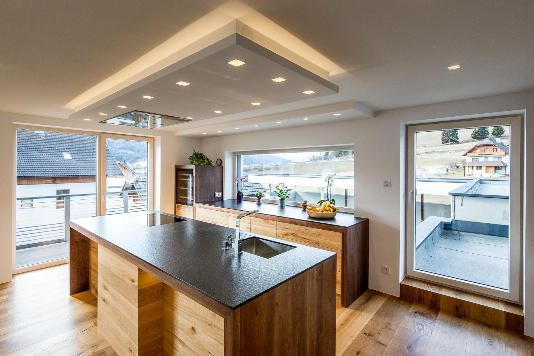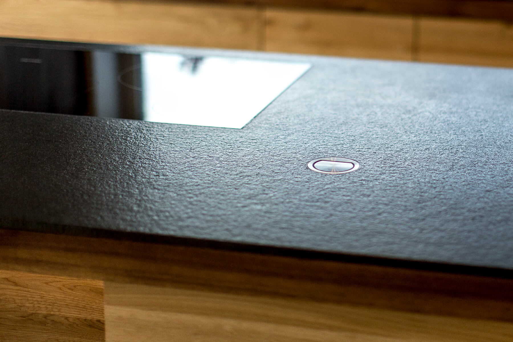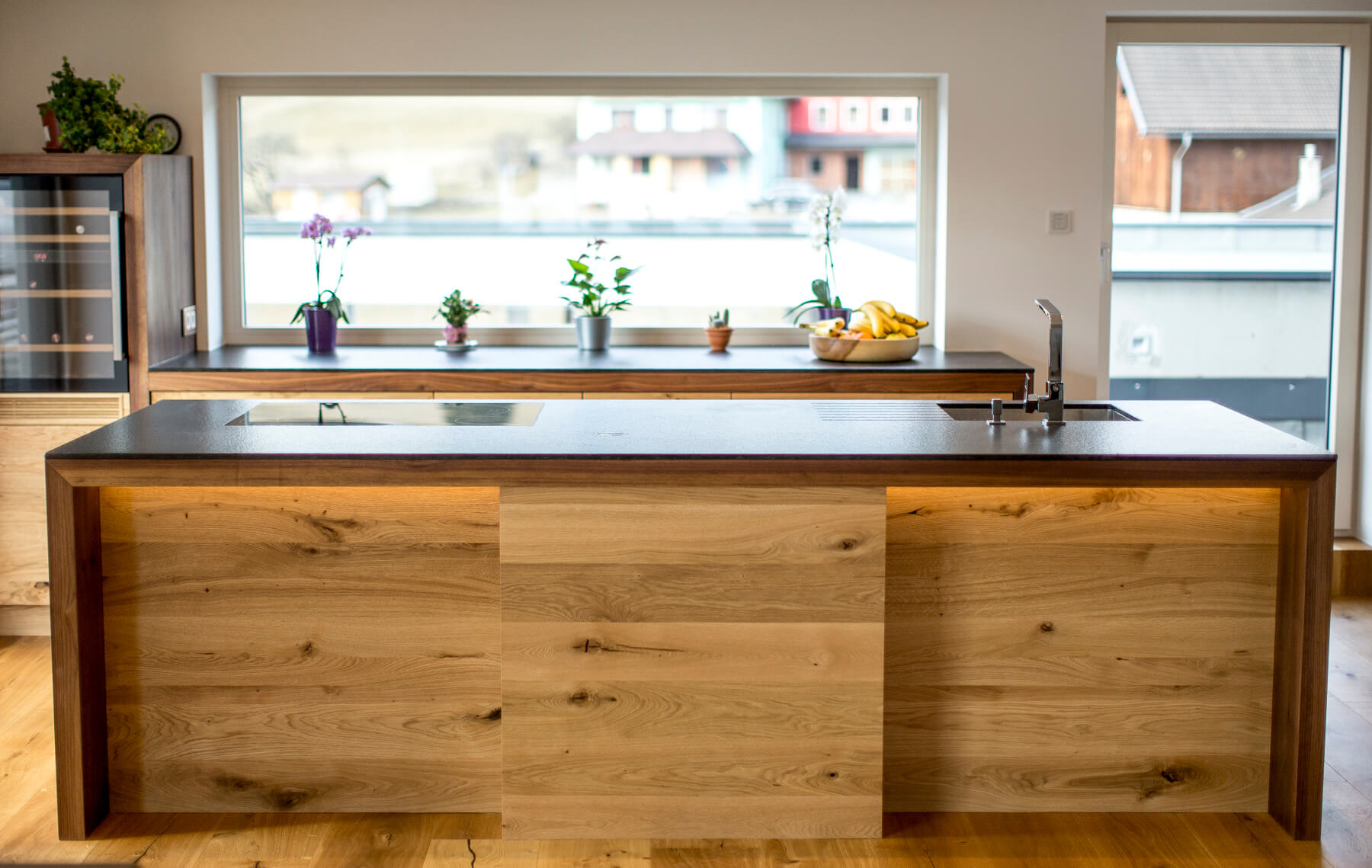 Die Bauherrin wollte sich in der Küche einen Mittelpunkt aus Naturmaterialien schaffen und endschied sich für Holz & Stein.