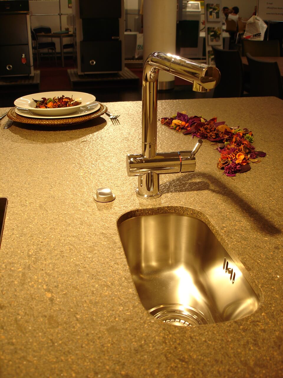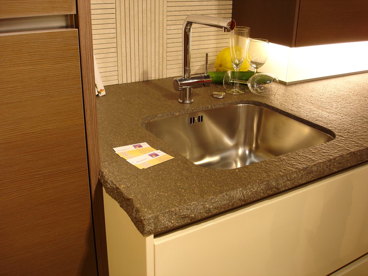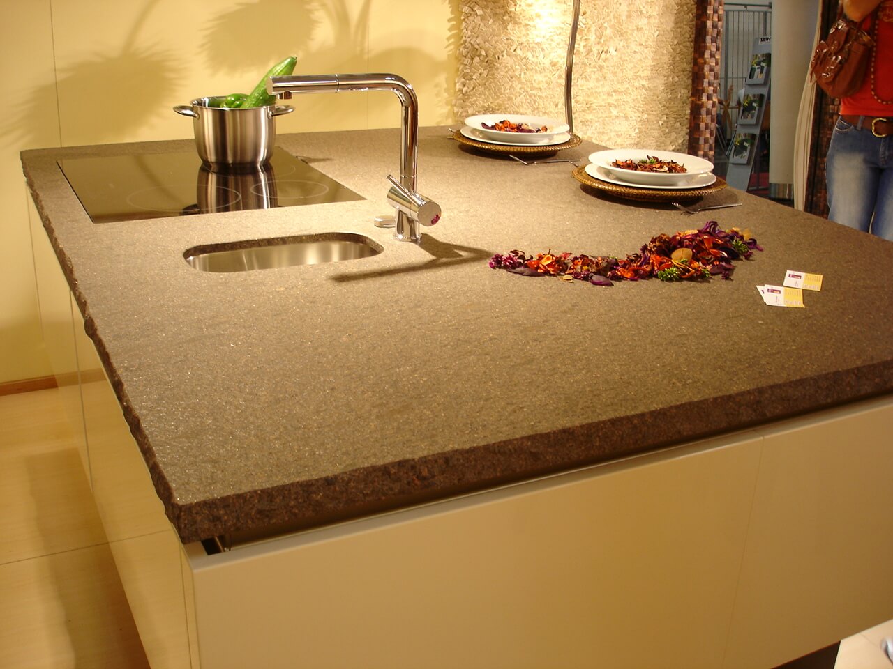 Bei diesen Küchenarbeitsplatten für eine Familie aus St. Leonhard am Forst wurde „Porphyr“ aus Patagonien verwendet. Stärke 4 cm, Oberfläche geflammt und gebürstet, Sichtkantenbearbeitung mit Bruchkante abgefast und gebürstet. Herdausschnitt flächenbündig, Spülenausschnitte abgestärkt auf 15 mm, Schnittfläche abgefast geschliffen und gebürstet. Steinkanten bündig mit den Fronten des Unterbaues.