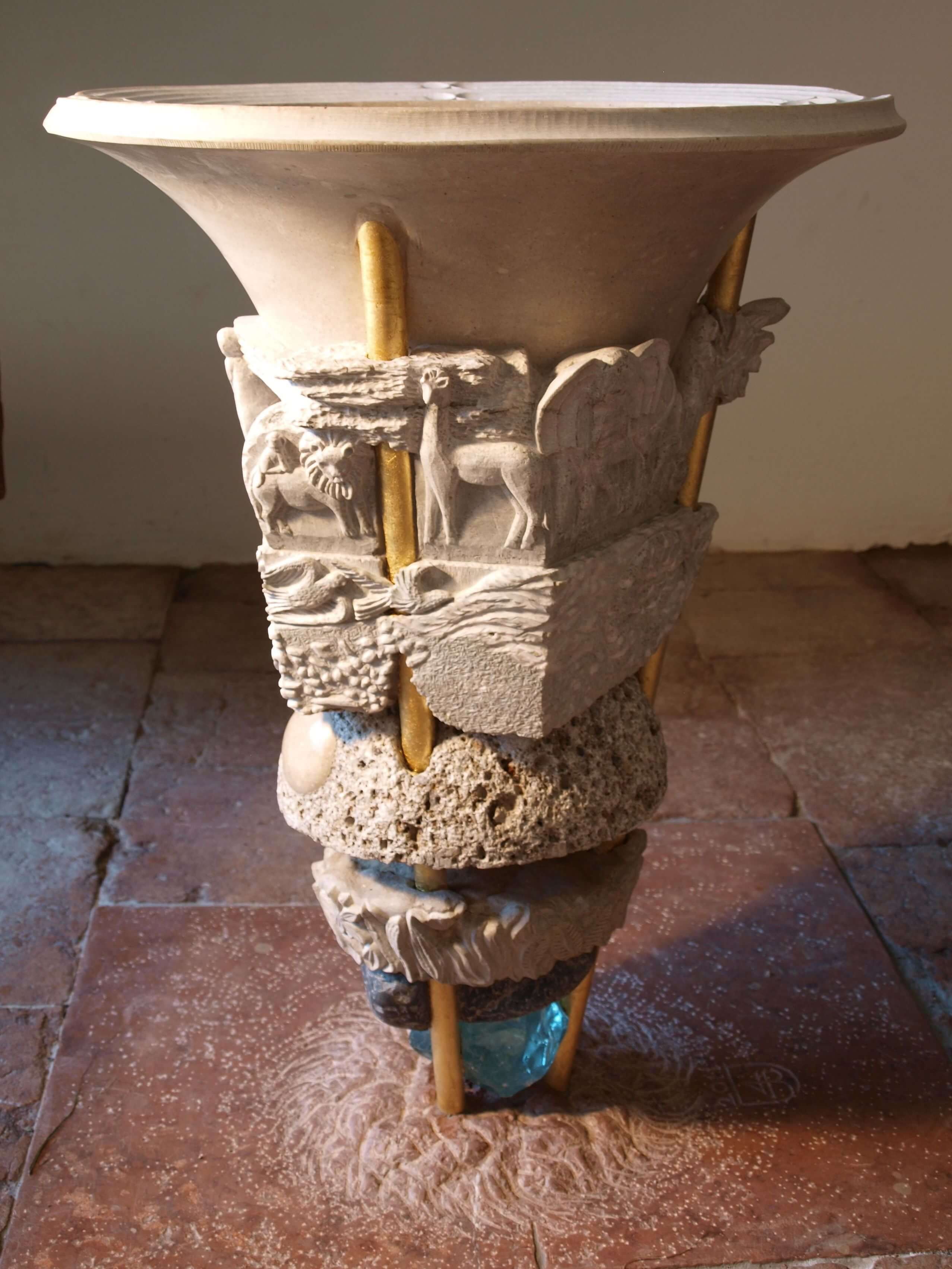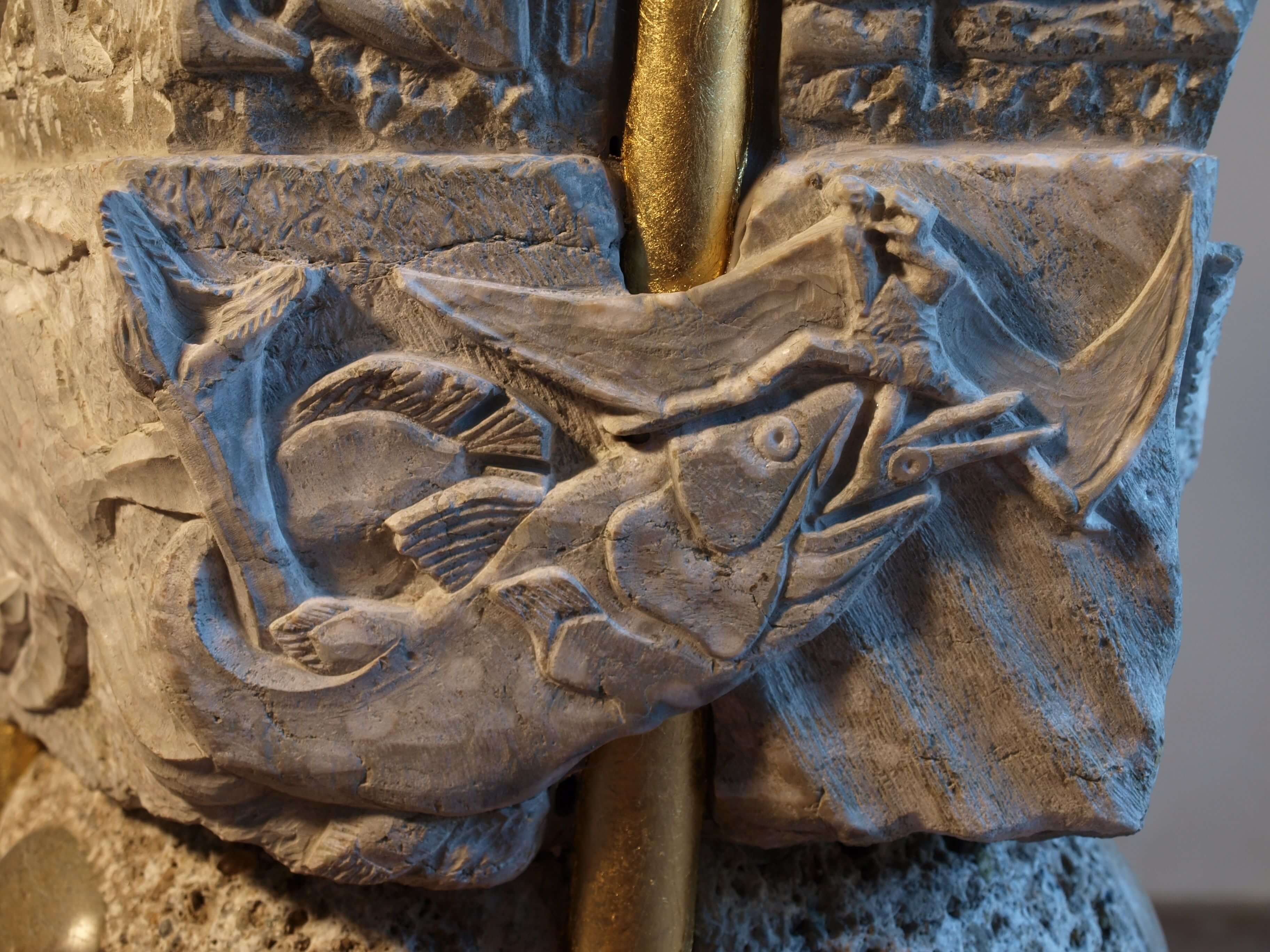Wenn man beim Westportal ins Innere der Goiser Kirche kommt, laden zwei Gestühle zu beiden Seiten der Wand zum Verweilen, Betrachten und Beten ein. Der Taufstein in der Mitte besteht aus sieben aufbauenden Werksteinen und wird von drei vergoldeten Gestängen durchdrungen. Diese stehen für den DREIEINIGEN GOTT – die Steine für die Schöpfung, die GOTT in sechs „Tagen“ schuf. Am Siebten ruhte ER von seinem Tun.