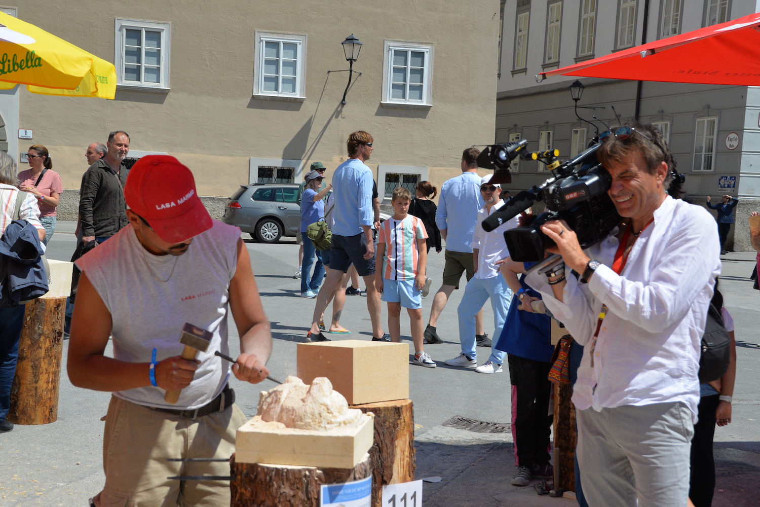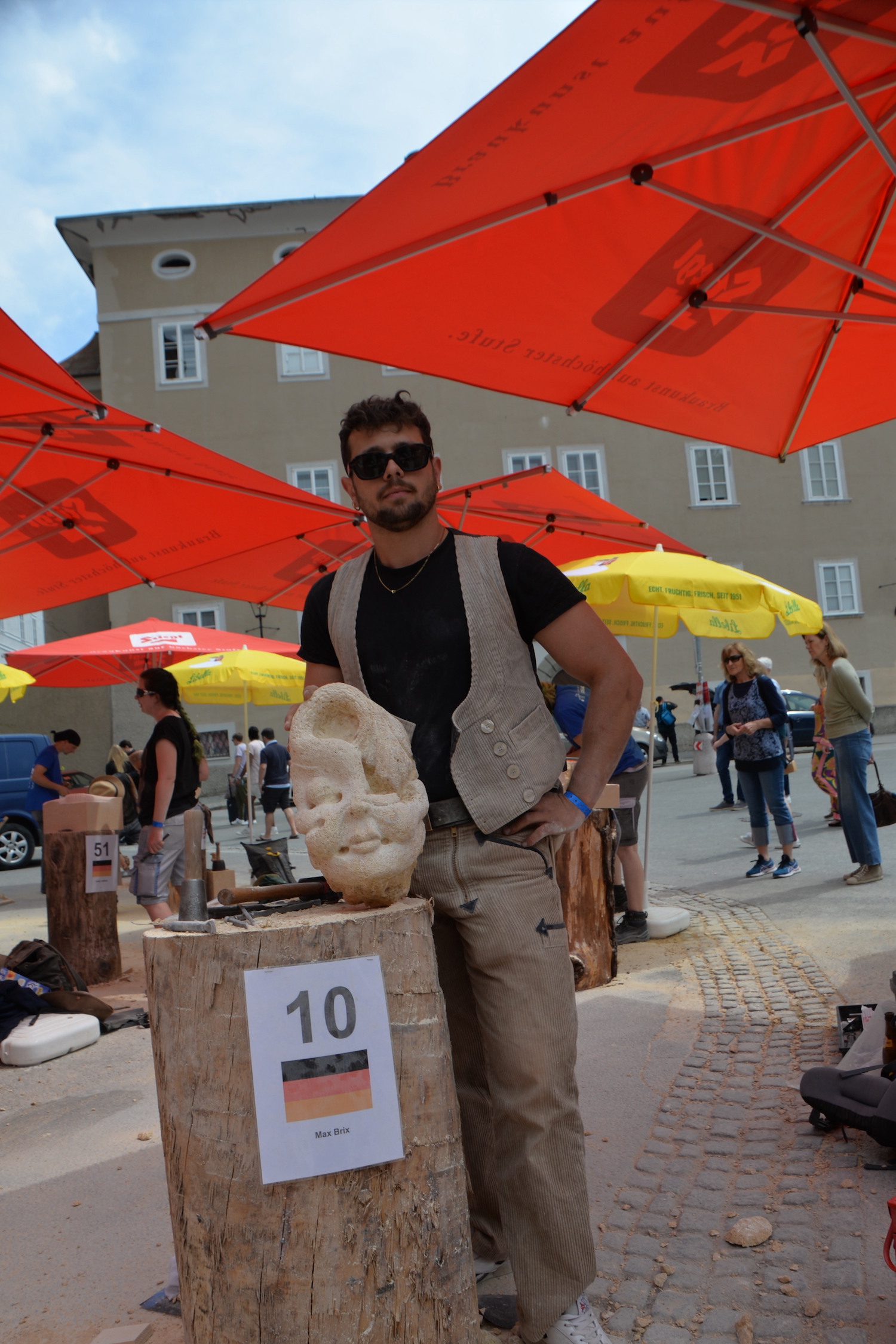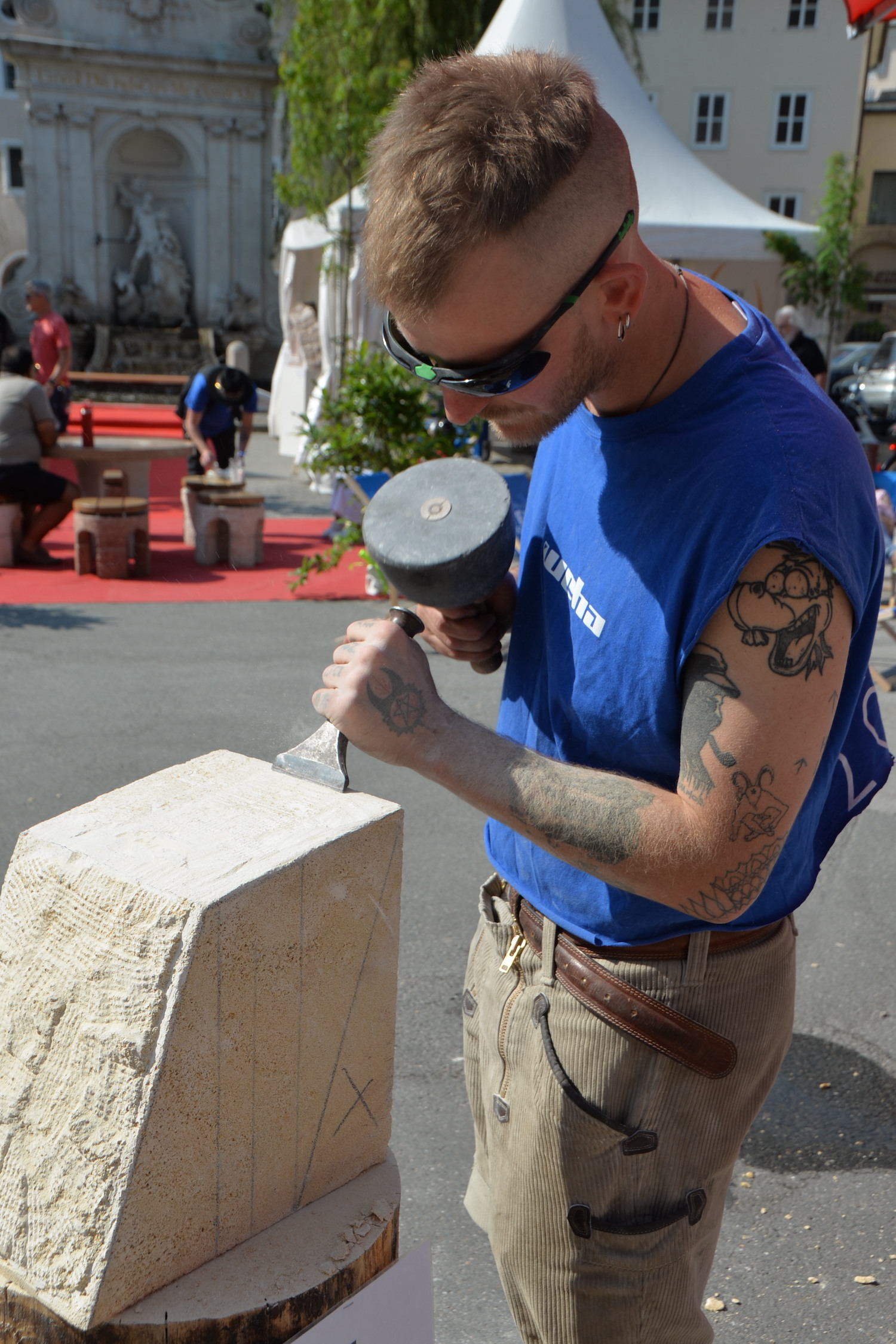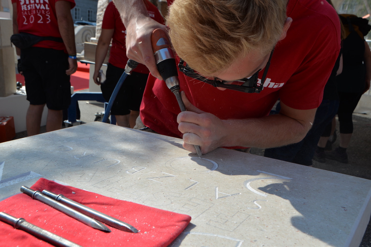 Am 03. und 04. Juni 2023 stand der Kapitelplatz in Salzburg ganz im Zeichen der Steinmetz-Kunst. Rund 110 Teilnehmende aus 12 verschiedenen Nationen demonstrierten live vor Ort ihr Können. Zahlreiche Besucher blickten begeistert den internationalen Steinmetzen und Bildhauern dabei über die Schulter, während diese im Wettbewerb ihre Skulpturen zum Thema „103 Jahre Salzburger Festspiele“ aus St. Margarethener Kalksandstein meißelten. Auch die Fachschule für Steintechnik und Steingestaltung der HTL Hallein feierte mit einer Präsentation von Designprojekten ihr 125-jähriges Bestehen im Zuge des Steinfestivals und stellte ihre Ausbildungsschwerpunkte vor. Beeindruckend war der Klang von über hundert hämmernden und meißelnden Steinmetzen im Herzen der Salzburger Altstadt.