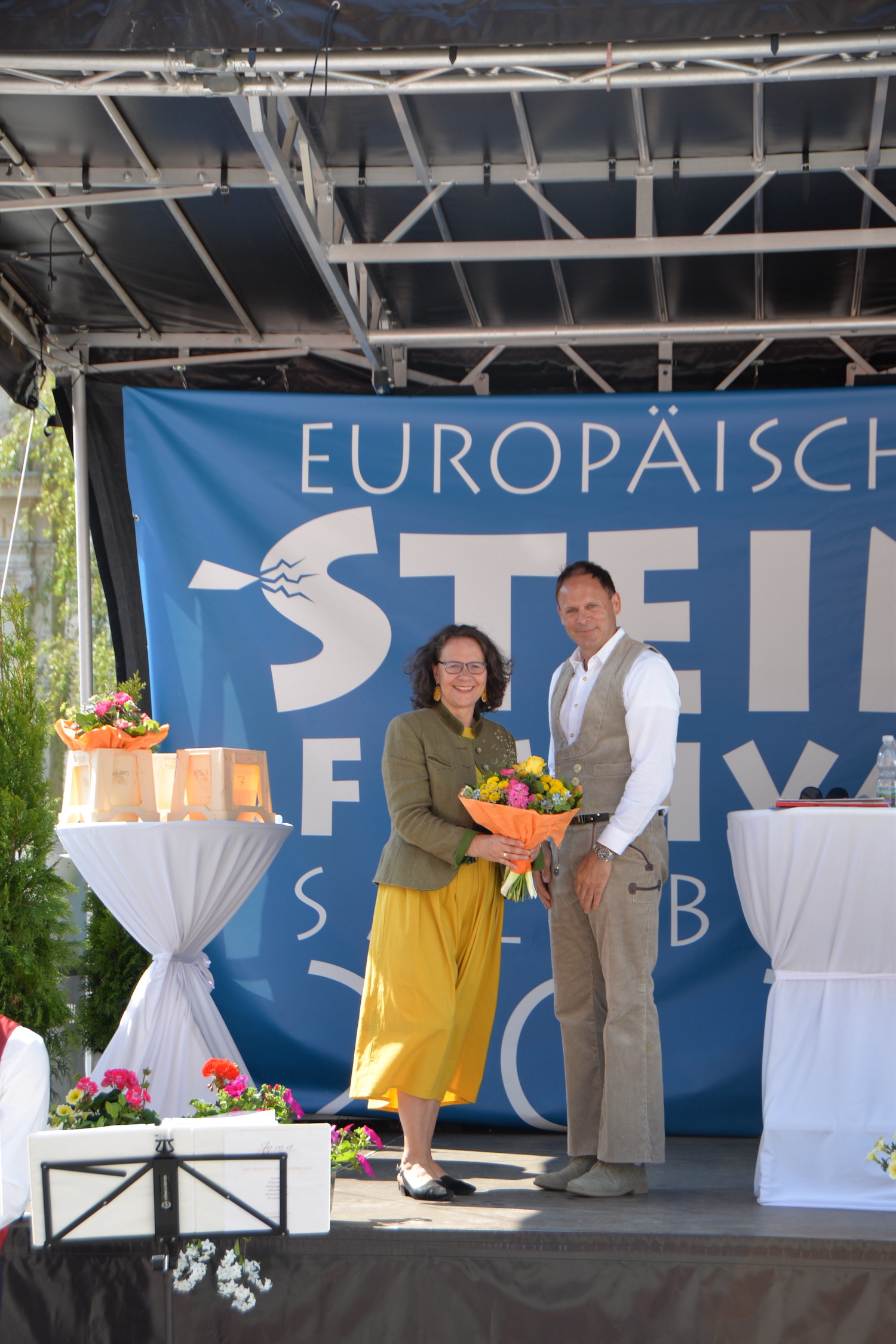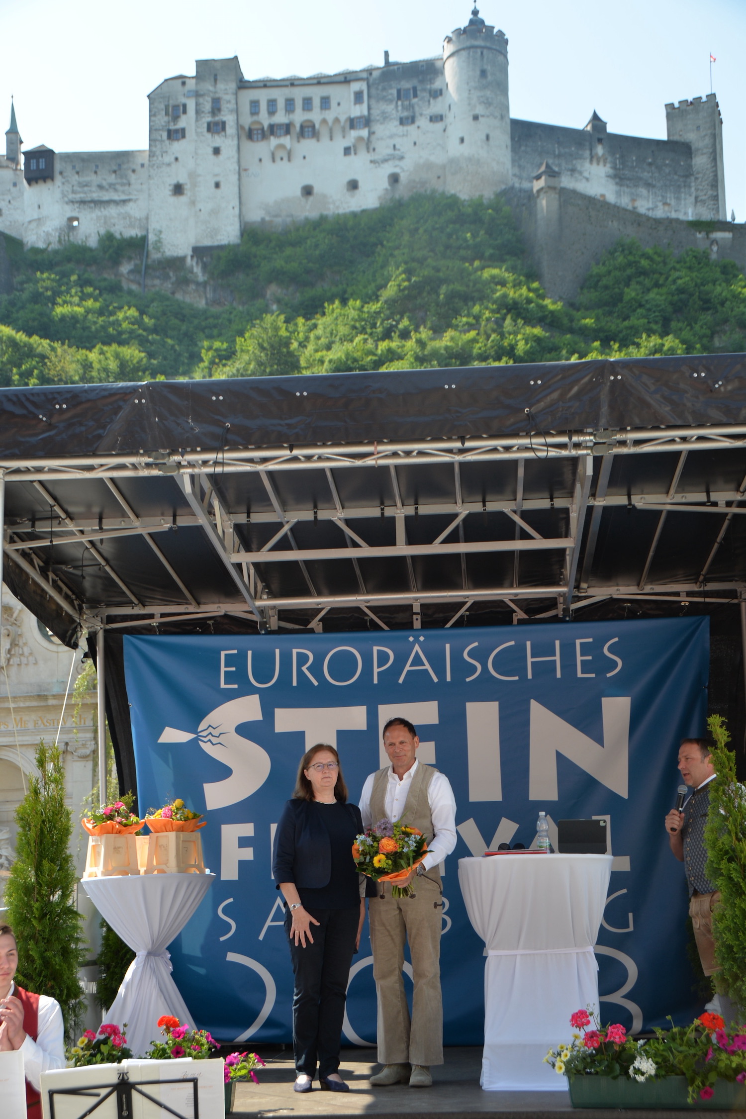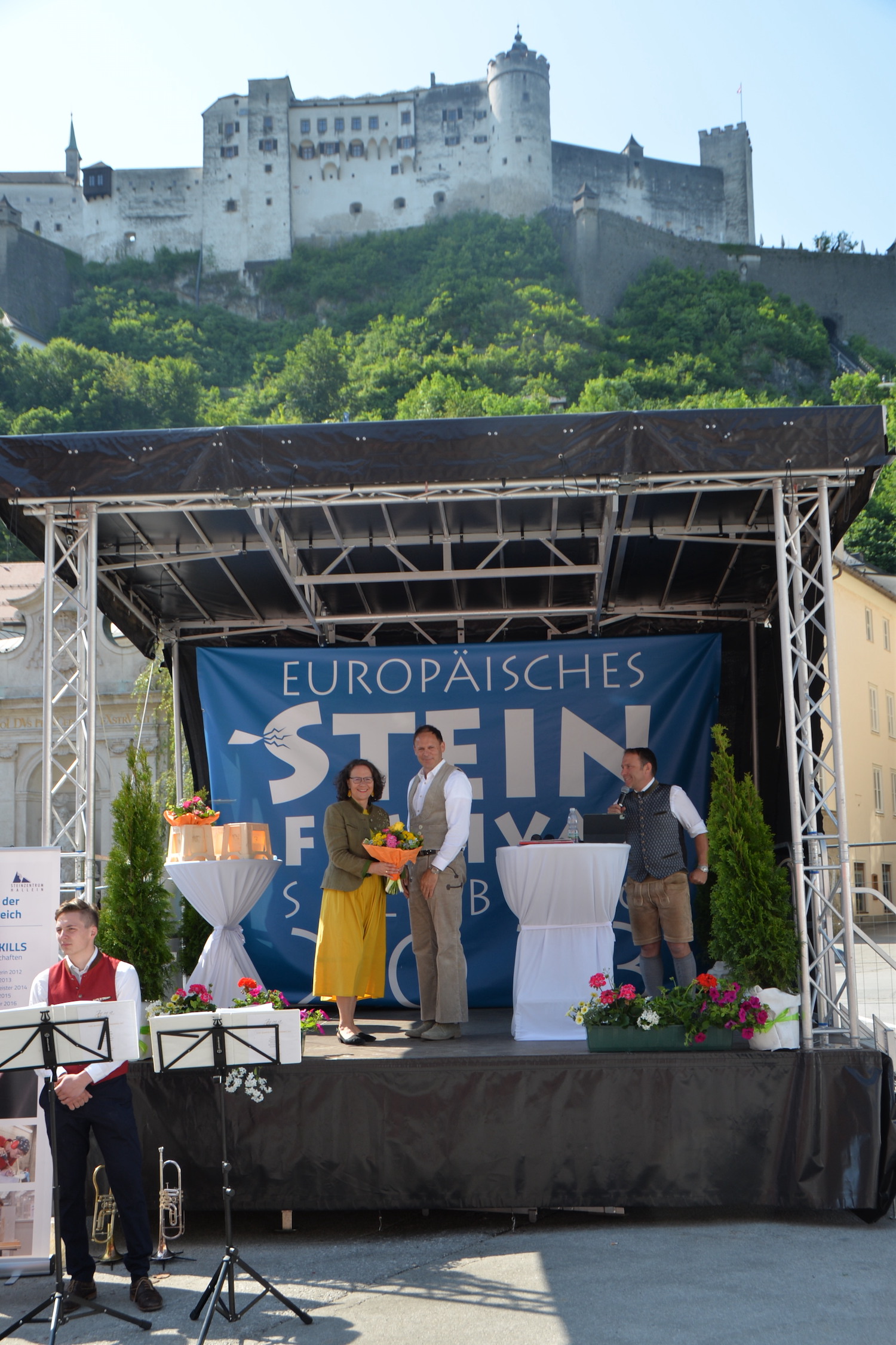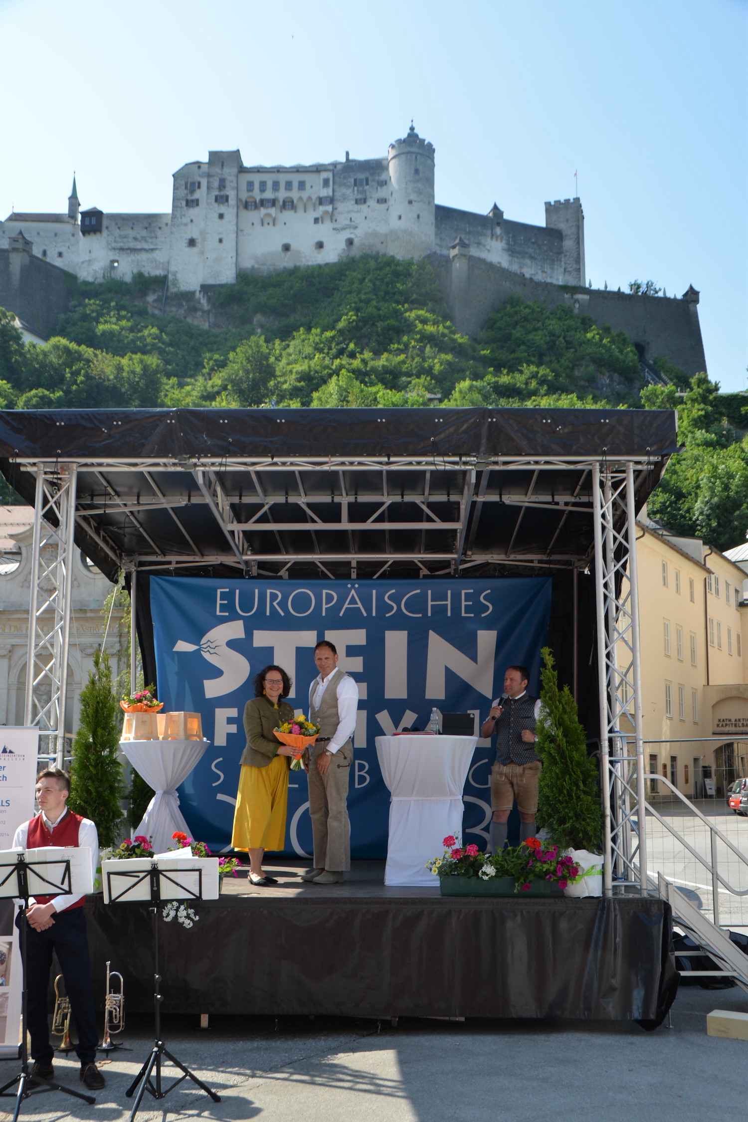 Im Rahmen einer feierlichen Eröffnung durfte der Moderator Georg Pollak mehrere Festredner auf der Bühne des Steinfestivals begrüßen. Dr. Elisabeth Kandler-Mayr, Ordinariatskanzlerin der Erzdiözese Salzburg ging auf die Verflechtung und Tradition von Naturstein und Kultur in Salzburg ein und Landesrätin Mag. Daniela Gutschi freute sich über das „Klingen des Steins im so steinreichen Salzburg“. Norbert Kienesberger, Bundesinnungsmeister-Stv. der Steinmetze Österreichs richtete Grußworte an alle nationalen und internationalen Gäste des Festivals und Veranstaltungs-Initiator Helmut Moser hatte schließlich die Ehre allen Teilnehmer ein zünftiges „Glück auf!“ zu wünschen.