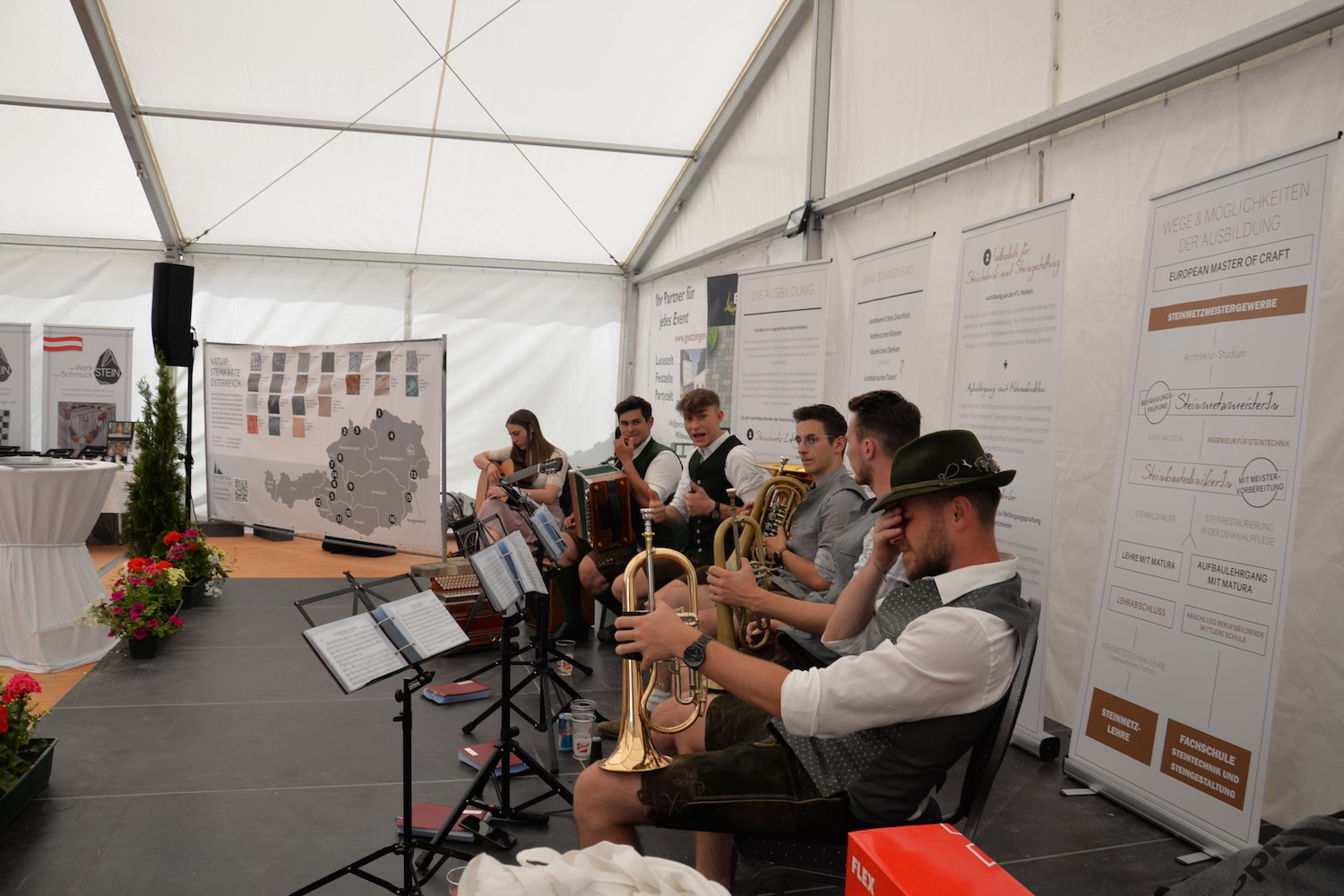 Während die Steinmetze eifrig an ihren Werkstücken arbeiteten, gab es für Besucher des Steinfestivals noch mehr zu erleben. Eine lebende Werkstätte und eine Mitmach-Station bei der man sich selbst als Steinmetz versuchen konnte fand vor allem bei den jüngsten Besuchern großen Anklang. Auch die Ausstellung der Design-Objekte der HTL Hallein wurde viel bestaunt. Im Festzelt wartete nicht nur Verpflegung auf die Gäste, sondern es wurde abends auch Livemusik mit der „Band Exit 207“ geboten und viele nutzen die Chance auf ein gemütliches Beisammensein.