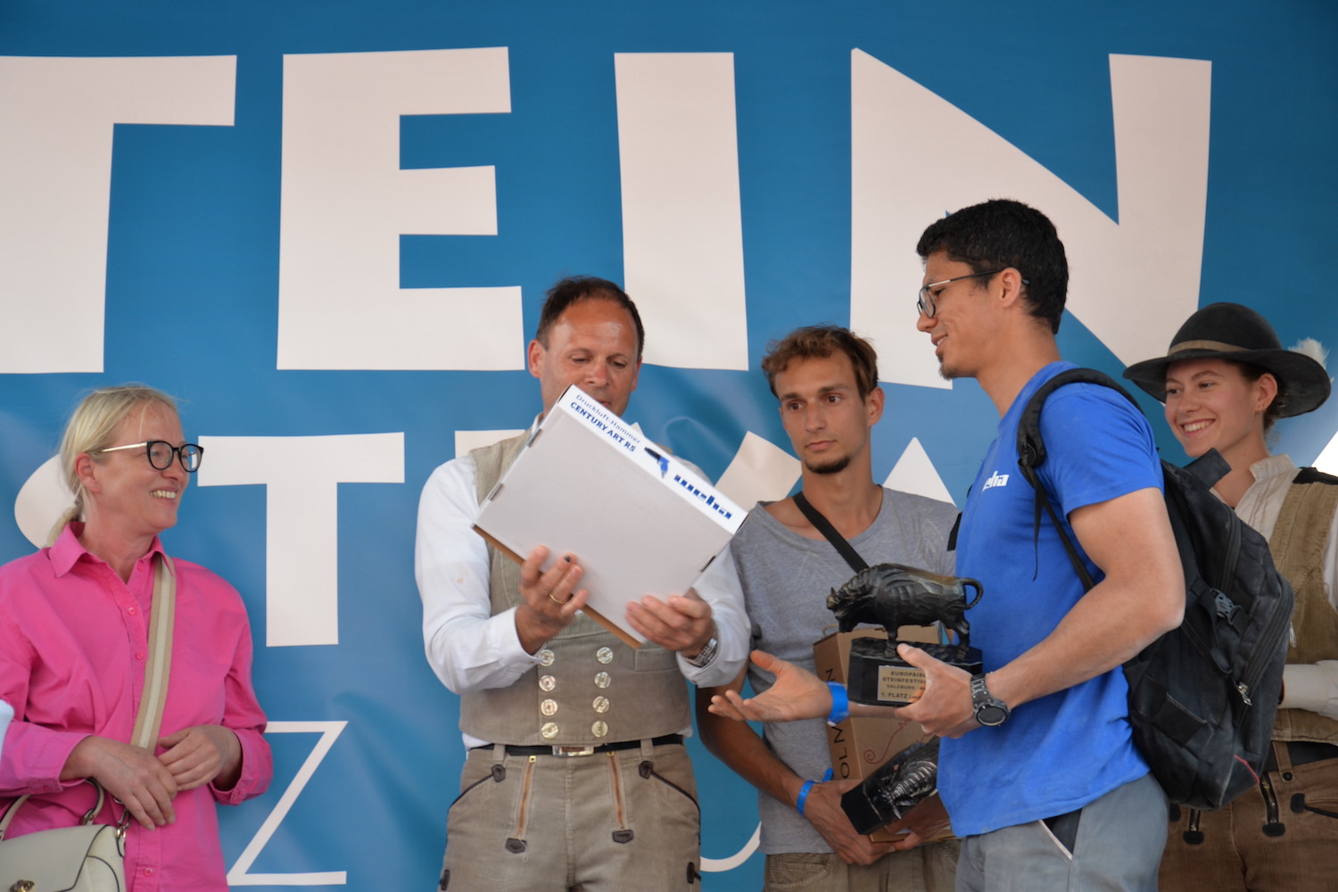 Im Rahmen einer feierlichen Eröffnung durfte der Moderator Georg Pollak mehrere Festredner auf der Bühne des Steinfestivals begrüßen. Dr. Elisabeth Kandler-Mayr, Ordinariatskanzlerin der Erzdiözese Salzburg ging auf die Verflechtung und Tradition von Naturstein und Kultur in Salzburg ein und Landesrätin Mag. Daniela Gutschi freute sich über das „Klingen des Steins im so steinreichen Salzburg“. Norbert Kienesberger, Bundesinnungsmeister-Stv. der Steinmetze Österreichs richtete Grußworte an alle nationalen und internationalen Gäste des Festivals und Veranstaltungs-Initiator Helmut Moser hatte schließlich die Ehre allen Teilnehmer ein zünftiges „Glück auf!“ zu wünschen.