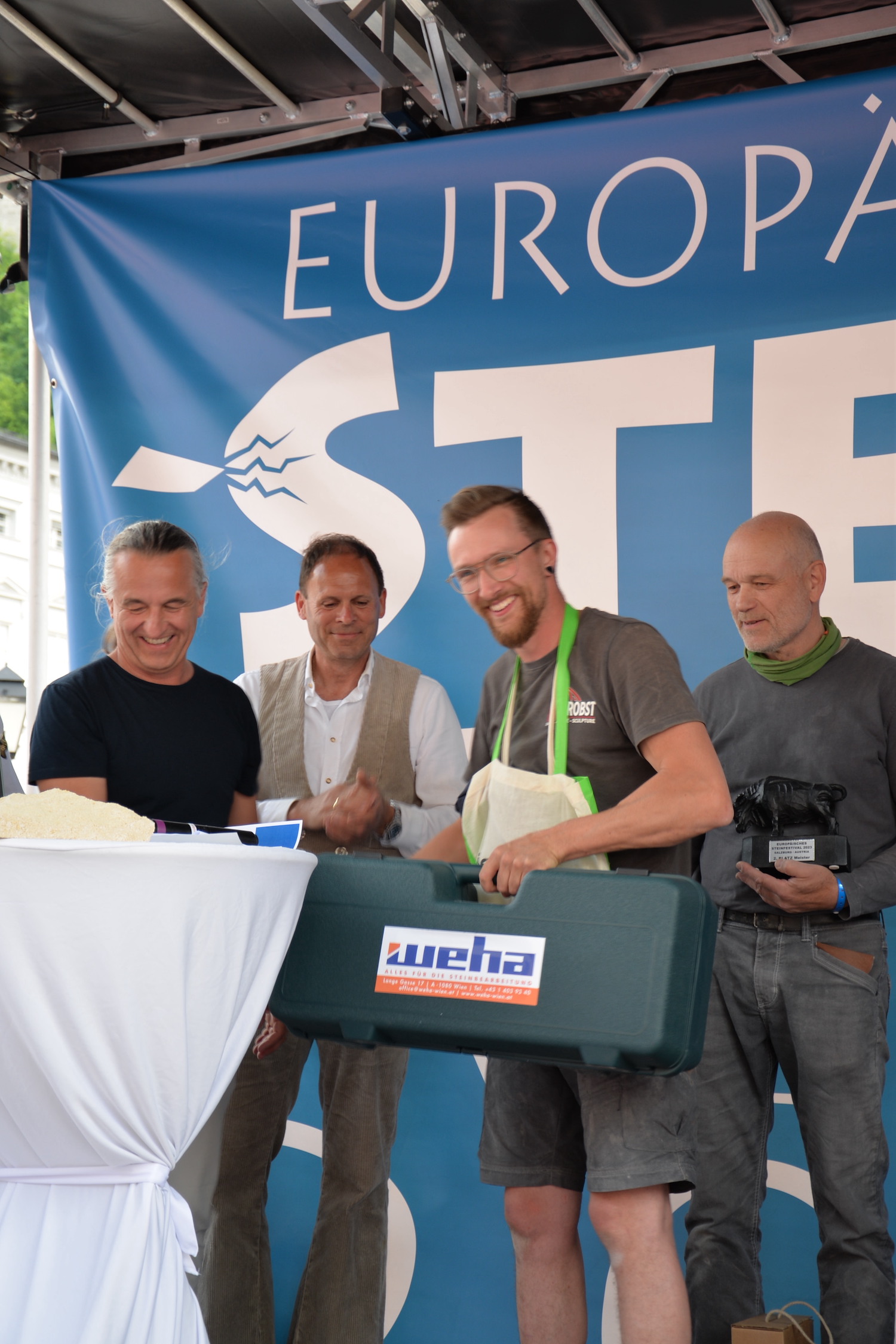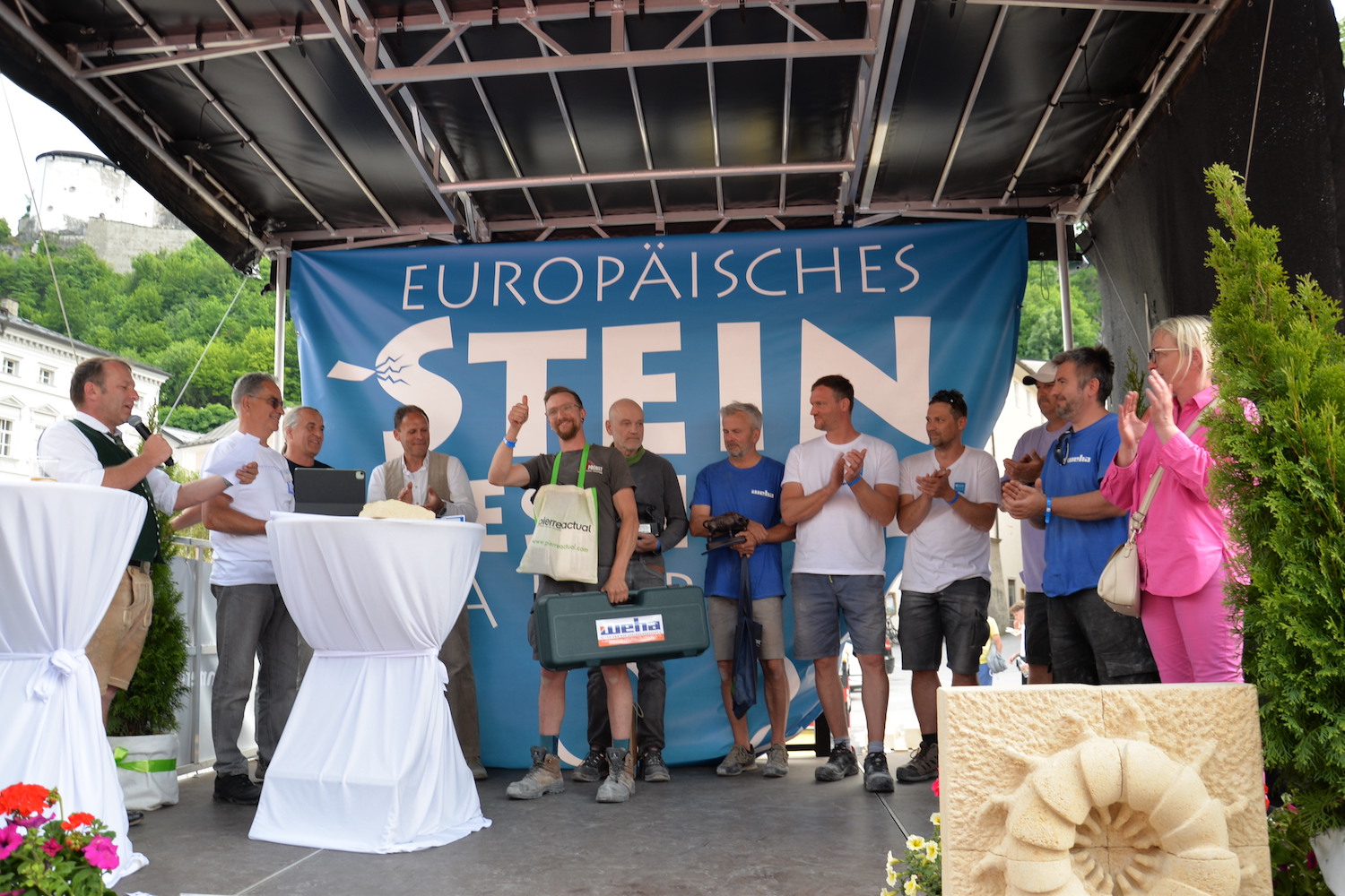 Bei dem über zwei Tage gehenden Bewerb der Steinmetze galt es, das vorgegebene Motto „103 Jahre Salzburger Festspiele“ in einem Objekt aus St. Margarethener Kalksandstein umzusetzen, ganz nach eigenen Ideen und Konzepten. Delegationen aus Deutschland, Frankreich und Ungarn begleiteten die Teilnehmer und bewunderten ihre Arbeit. Dr. Gerd Merke, Generalsekretär der EUROROC, betonte die europäische Dimension dieser Veranstaltung. Sowohl ihm als auch dem Europäischen Steinfestival ist es ein Anliegen, die Nachhaltigkeit von Naturstein als Baumaterial zu vermitteln.“ Nach Abschluss der Arbeiten schritt eine fachkundige, internationale Jury zur Begutachtung und Beurteilung der einzelnen Werkstücke. Jury-Mitglied Bernhard Hasenöhrl (Steinmetzmeister und Euro/Worldskills-Trainer) freute sich über das hohe handwerkliche Niveau der präsentierten Arbeiten. Martin Schmeiser (Steinmetzmeister und Jury-Mitglied) erklärte, dass zahlreiche Durchgänge und gemeinsame Gespräche in der Jury zur Prämierung der Siegerarbeiten notwendig sind. Auch Norbert Stoffel (Jury Mitglied und Präsident EASMS Frankreich) war positiv überrascht von den vielen kreativen und hochwertigen Projekten. Zusammen mit Gabriella Csanadi (Landesinnungsmeister-Stv. Ungarn) und Norbert Kienesberger wurden schließlich die Preisträger in den Kategorien Lehrling, Geselle, Meister und Gruppenarbeit festgelegt.